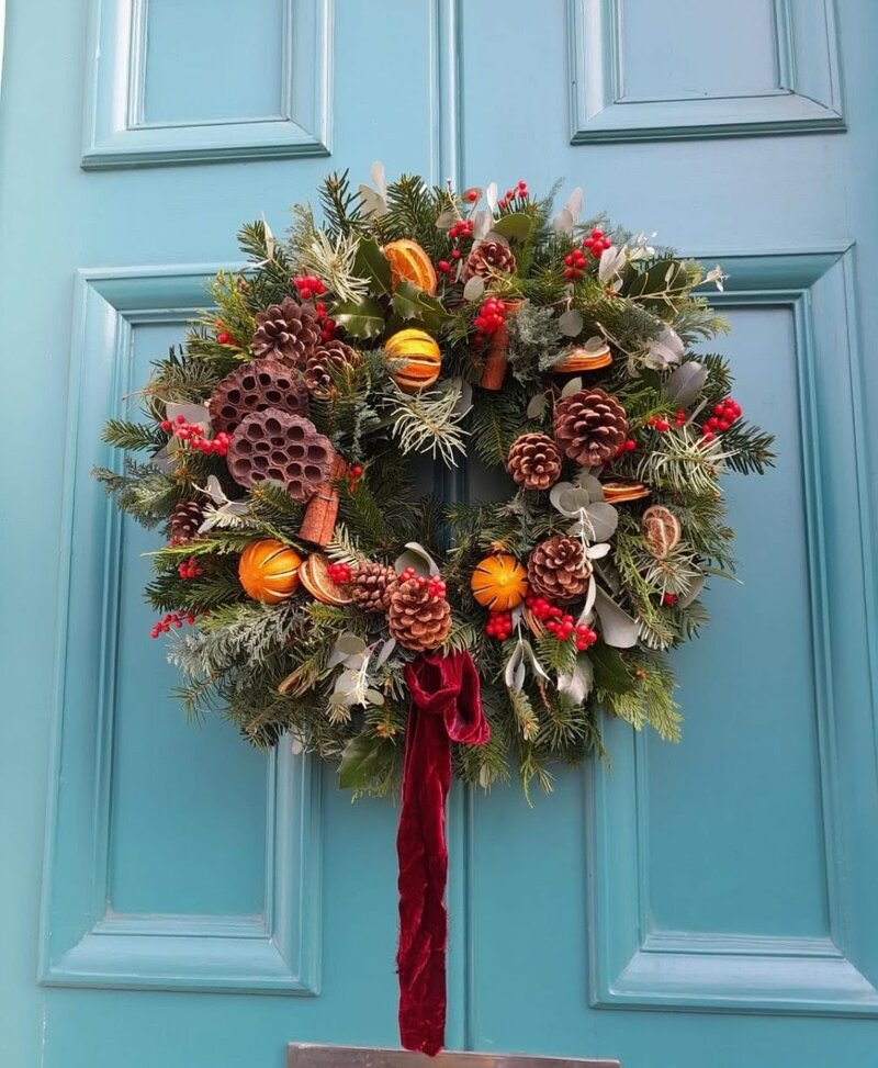 Un connubio perfetto tra tradizione e stile: il rosso intenso delle bacche e dei nastri si unisce alla naturalezza delle pigne e del verde boschivo, creando un’atmosfera calda e raffinata.